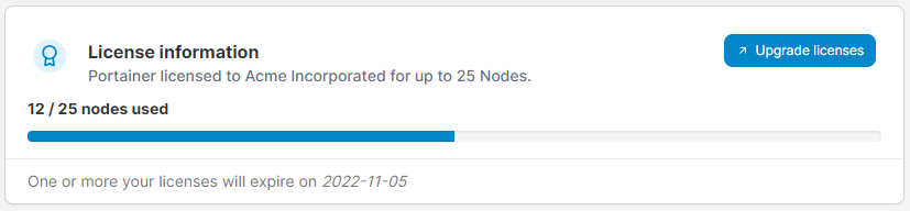 From the menu select Licenses. The License Information section summarizes information about your license including how many nodes it covers and how many nodes are currently being used, as well as the license expiry date. You can click Upgrade licenses to purchase additional licenses.
