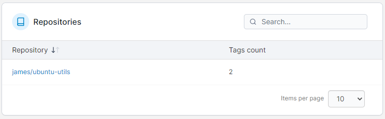 A list of the repositories within a registry, along with the number of tags for each repository appears. Select a repository to view its details.