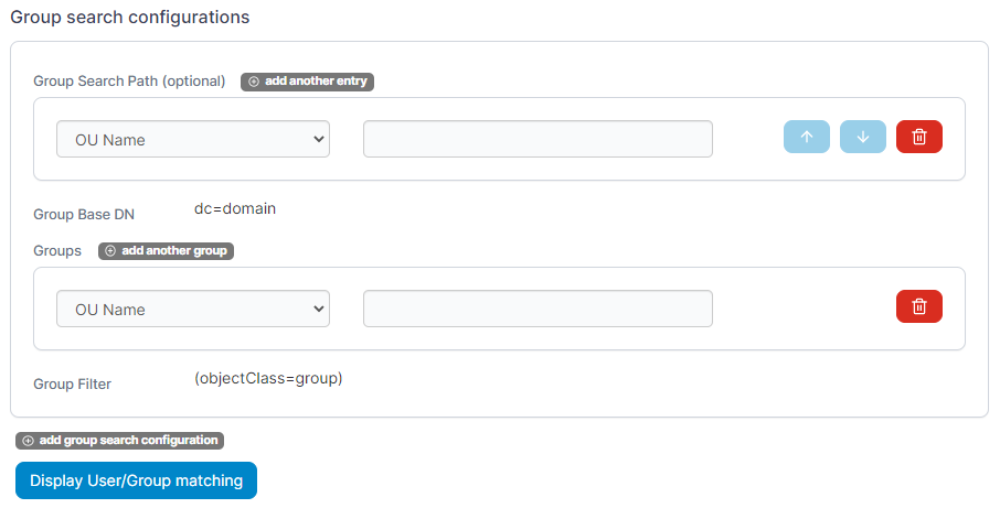 Configure the group search configurations using the table below as a guide. Click add group search configuration to set up multiple configurations.