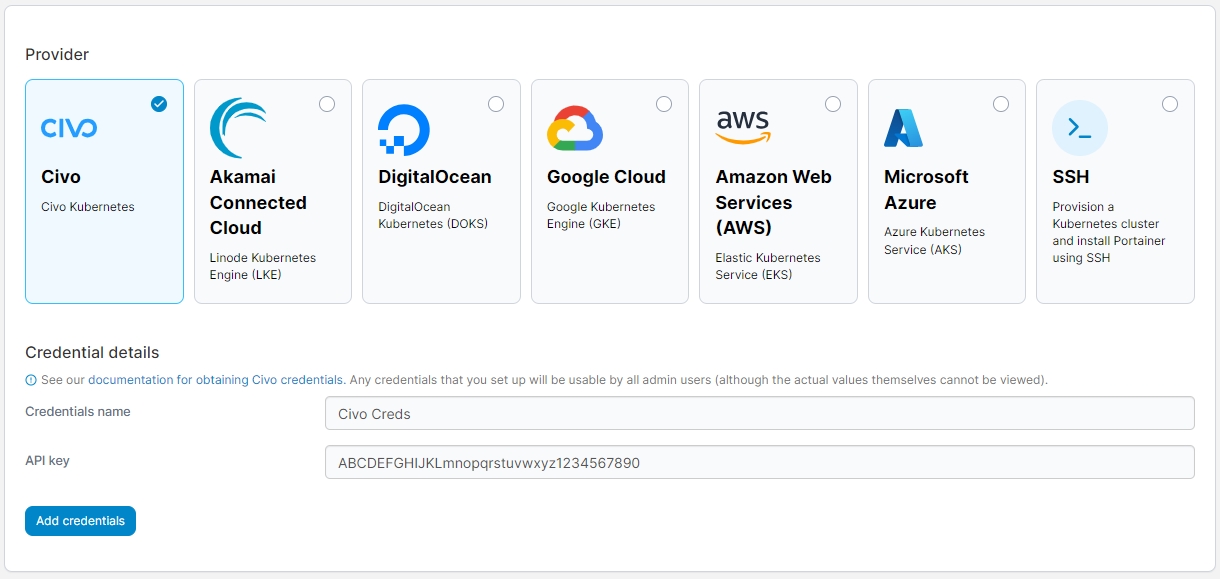 When you're ready, click Add credentials. Your credentials will now be available to you when provisioning a Kubernetes cluster on Civo.