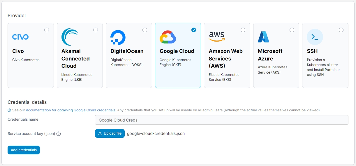 Before you can add your Google Cloud credentials to Portainer, you will need to configure your account for GKE, set up a service account, and retrieve the private key for that service account. Once this is complete, you can use the private key to set up access.
