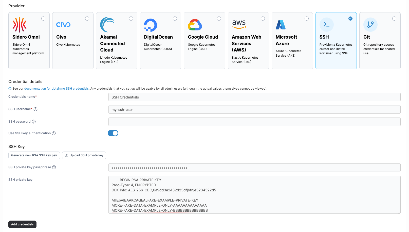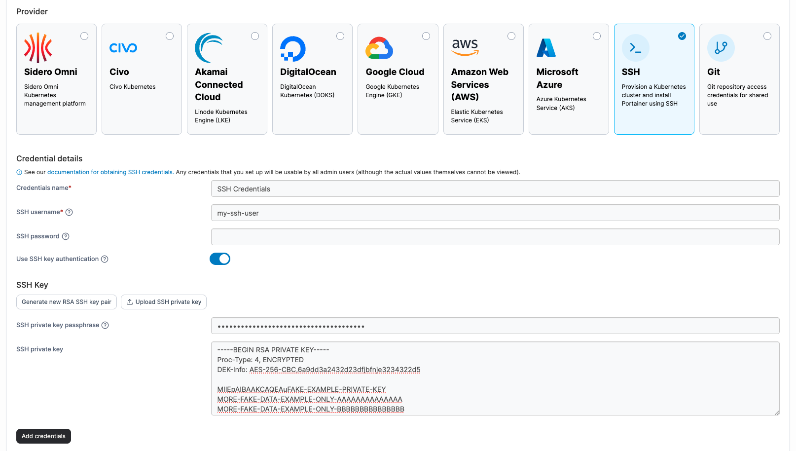 SSH credentials are currently used by Portainer in our Kubernetes provisioning feature. Credentials created here will be usable by any admin-level user, though they will not be able to view the actual credentials directly.
