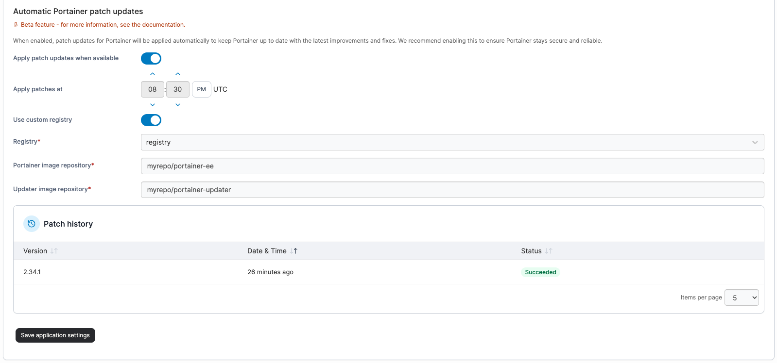 Toggle **Apply patch updates when available** to enable your Portainer version to be automatically updated when a new patch is released. Automatic updates will *only* apply to patches, for example from 2.35.0 to 2.35.1. Your Portainer version will not automatically update with major or minor releases (2.35.0 to 2.36.0 for example).&#x20;