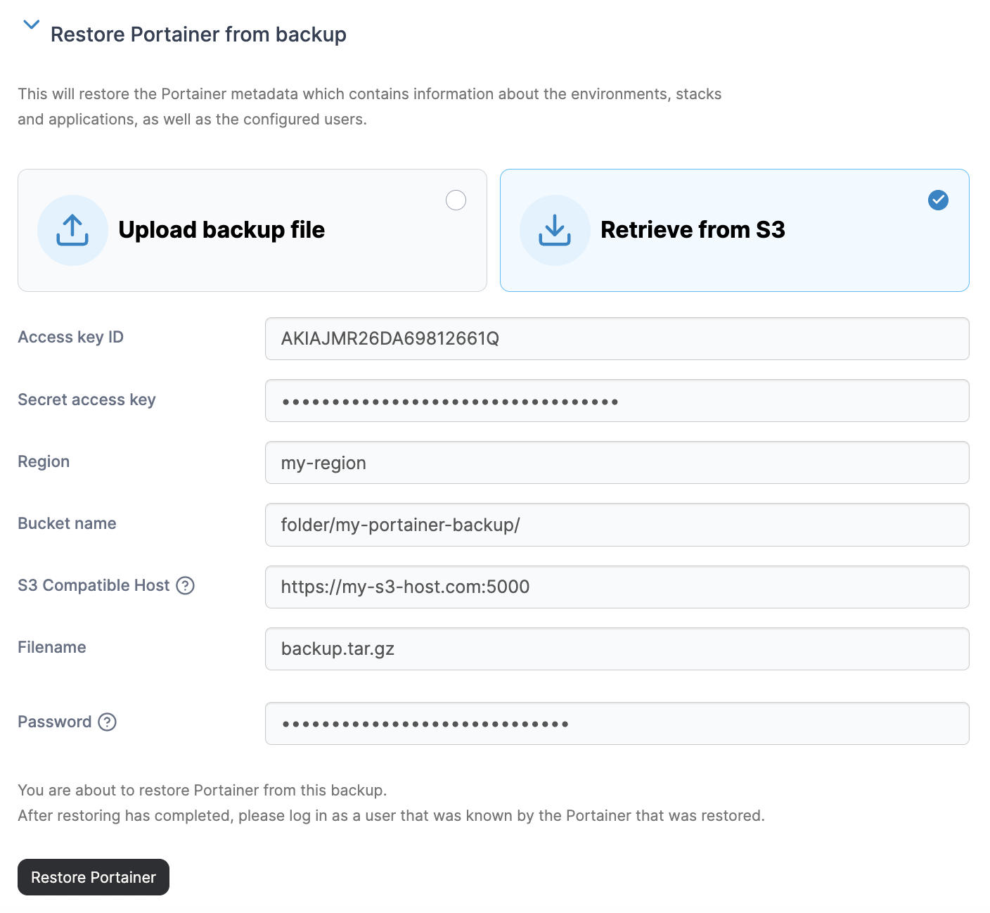 Restoring a configuration is only possible on a fresh instance of Portainer during the initial installation. When you need to restore Portainer, deploy a fresh instance of Portainer with an empty data volume and choose the **Restore Portainer from backup** option during setup, making sure to select **Retrieve from S3**. Complete the fields using the table below as a guide.