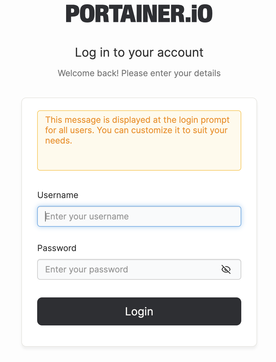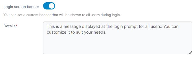 This setting allows you to specify a custom text banner that will appear on the login screen for all users. This could be used to provide informational detail, a warning message, or whatever you need. To enable this, toggle the **Login screen banner** option on and enter your message in the **Details** box.