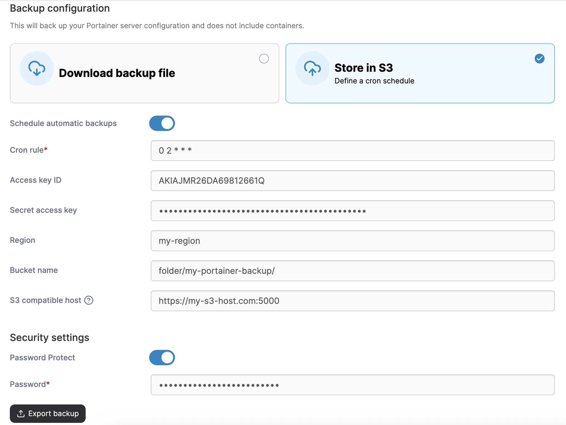 With Portainer Business Edition you have the option to store a backup of your configuration in an S3 bucket, either on demand or on a defined schedule.
