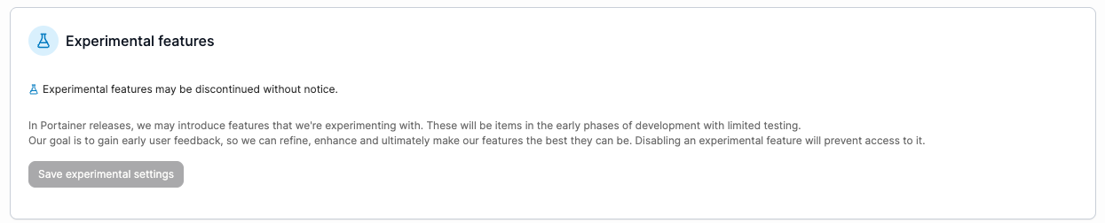 This section allows you to enable experimental Portainer features for use in your deployment. These features are in early development and have gone through a limited set of testing, and are provided to users in order to gather feedback on the feature at an earlier stage of development.