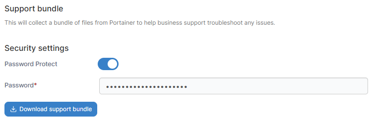You can optionally choose to password protect the bundle by toggling on **Password Protect** and setting a password. If you do choose to set a password, ensure you provide the password to the Portainer support team when you supply the bundle.