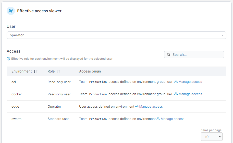 Scroll down to the **Effective access viewer** section and select a user from the **User** dropdown. The user's roles and their access on your environments will display. Select **Manage access** on any row to be taken to the [environment's access configuration](https://docs.portainer.io/environments/environments#manage-access).