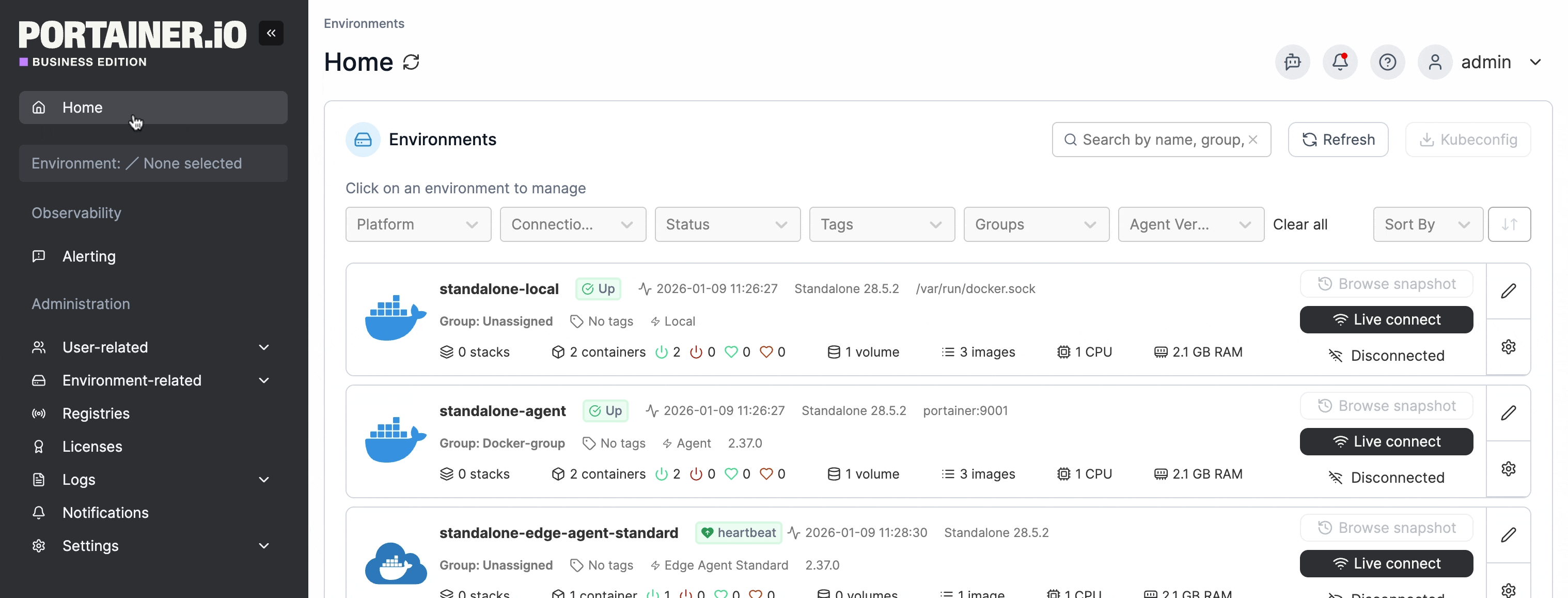 * **Environment administrator** has full access within a given environment, but cannot make any changes to the infrastructure that underpins an environment (i.e. no host management), nor are they able to make changes to Portainer internal settings. Environment administrators are also unable to change ownership of resources.
