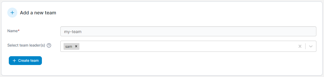 Enter the name of the team and optionally select team leaders. Team leaders can add and remove existing users to and from their team, as well as promote existing team members to co-team leaders.