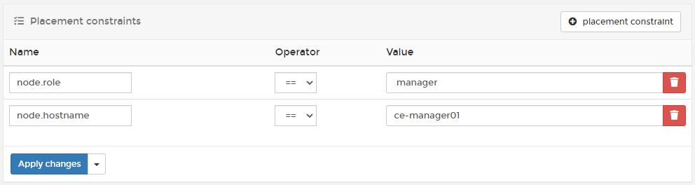 Click the placement constraint button to add a new constraint. Enter node.hostname for the Name and the hostname you gathered previously for the Value.