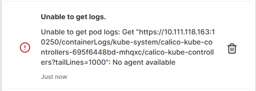 Unable to get pod logs: Get “https://<IP>:10250/… : No agent available
