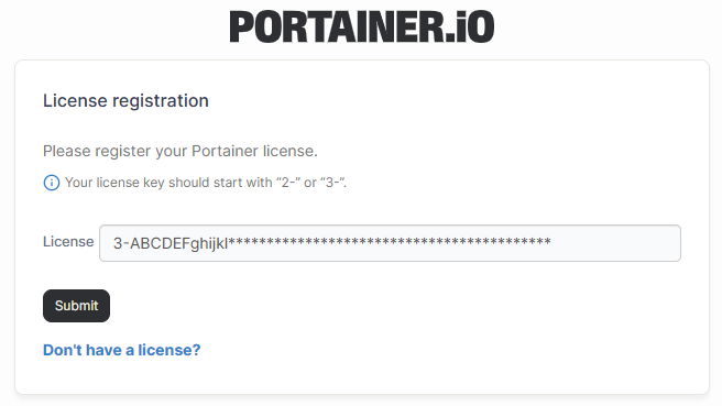 You will now be asked to provide your license key. You will have been provided this when signing up for Business Edition or the free trial. If you don't have a license key, you can either click the **Don't have a license?** link or [get in touch with our team](mailto:success@portainer.io).