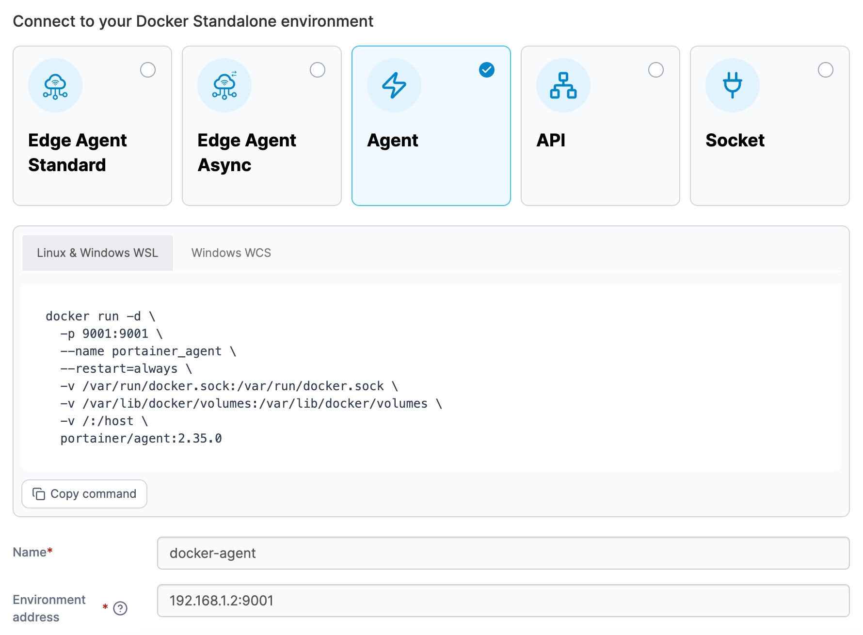 Next, select Docker Standalone as the environment type then click Start Wizard. Select the Agent option, then your environment type. Copy the command for your environment type and run it on your Docker Standalone instance. For example, if you are deploying on a Linux machine or a Windows machine with WSL installed, use the Linux & Windows WSL command. If you are deploying on a Windows machine with WCS, use the Windows WCS command.