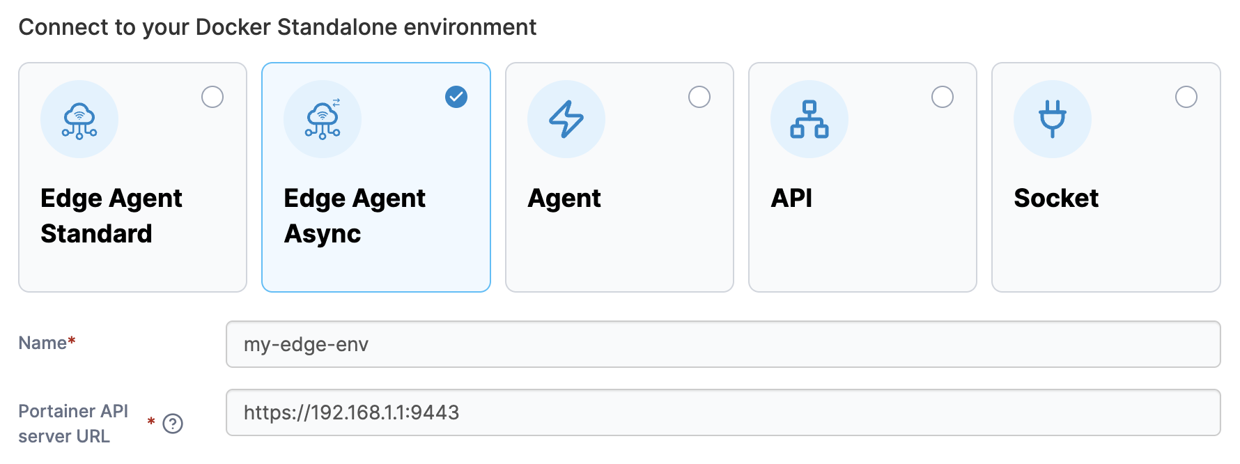 Select Docker Standalone then click Start Wizard. Then select the Edge Agent Async option. Enter the environment details using the table below as a guide.