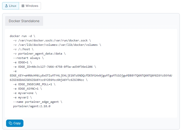Choose your platform (Linux or Windows), copy the generated command and run the command on your Edge environment to complete the installation.