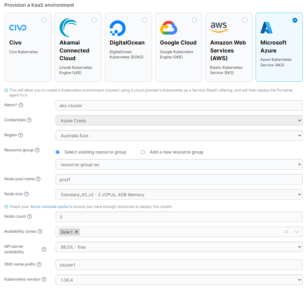 You can manually refresh the options available from Azure by clicking Reload cluster details under the Actions section.