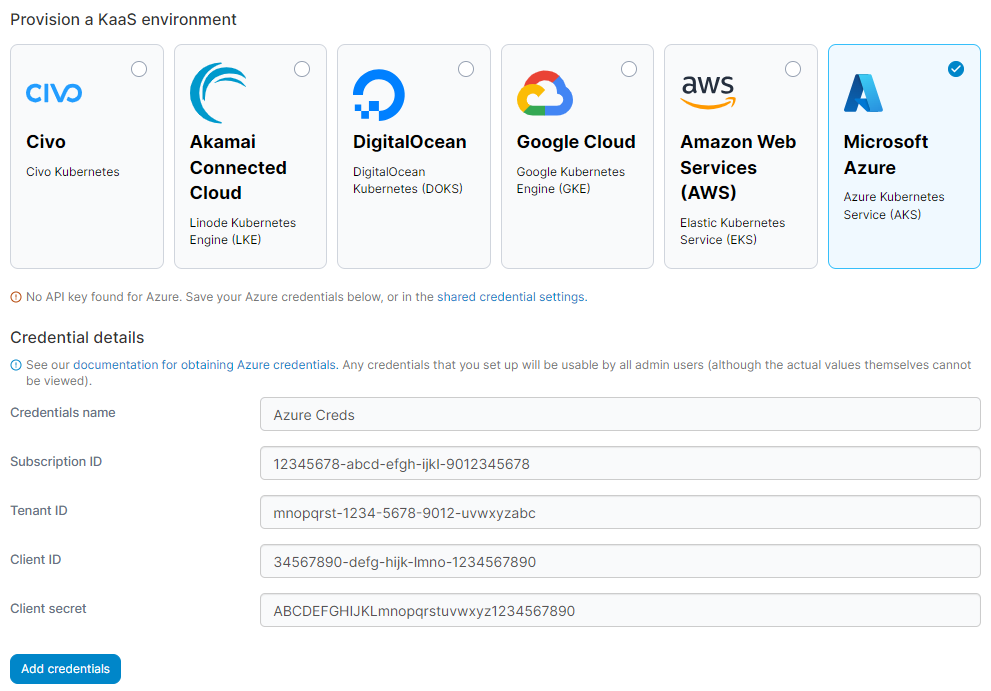 Select the Azure option from the list of providers. If you haven't already configured credentials for Azure you'll be asked to provide them now. Enter a name for your credentials then enter your Subscription ID, Tenant ID, Client ID and Client Secret. Once this is done, click Save.