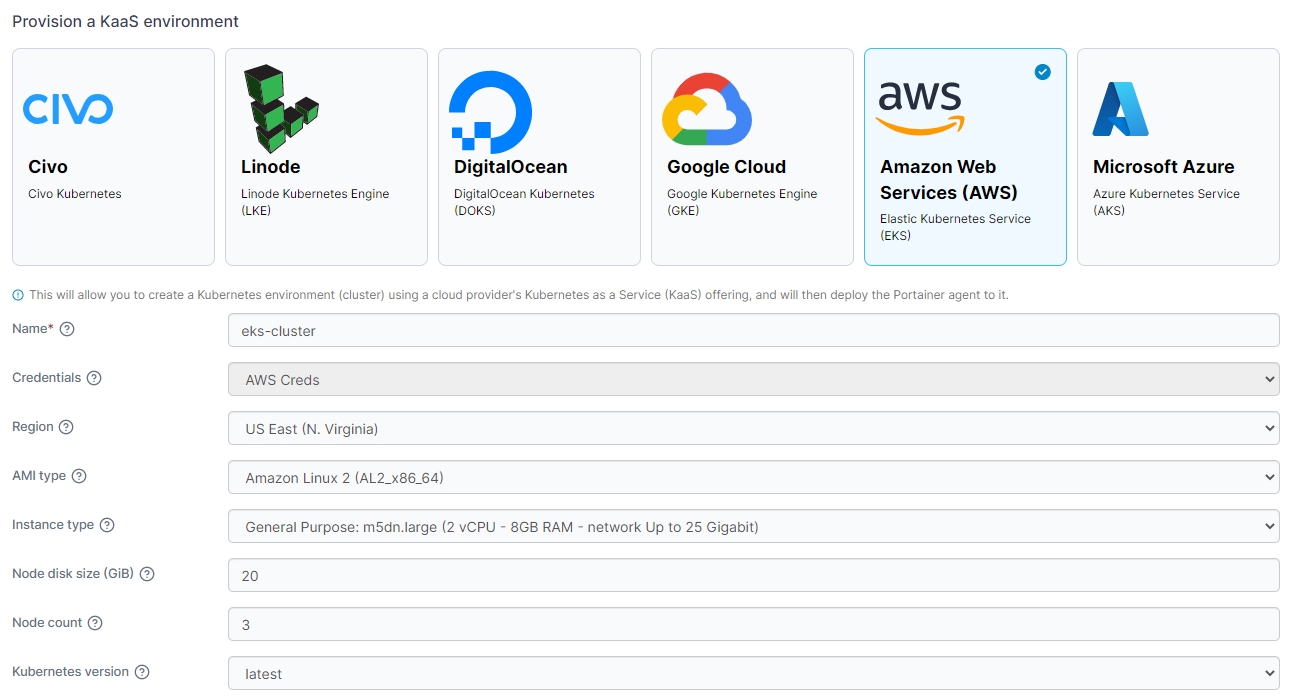 Once you have added your credentials (or if you already had them set up) select your cluster options from the fields below.