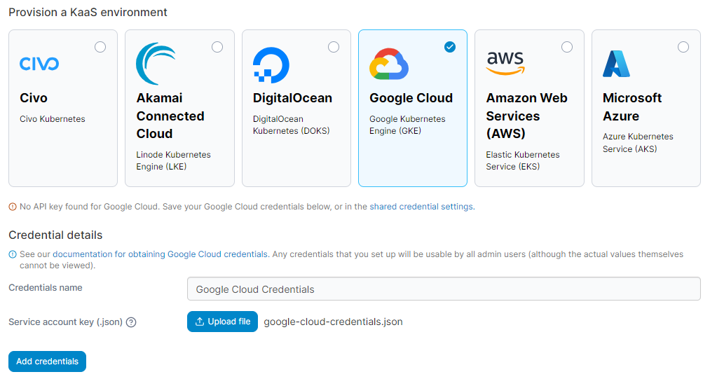 Select the Google Cloud option from the list of providers. If you haven't already configured credentials for Google Cloud you'll be asked to provide them now. Enter a name for your credentials then click Upload file and select your JSON private key. Once this is done, click Save.