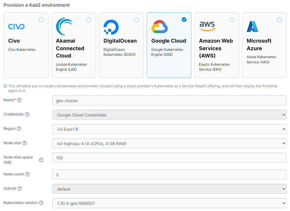 You can manually refresh the options available from Google Cloud by clicking Reload cluster details under the Actions section.