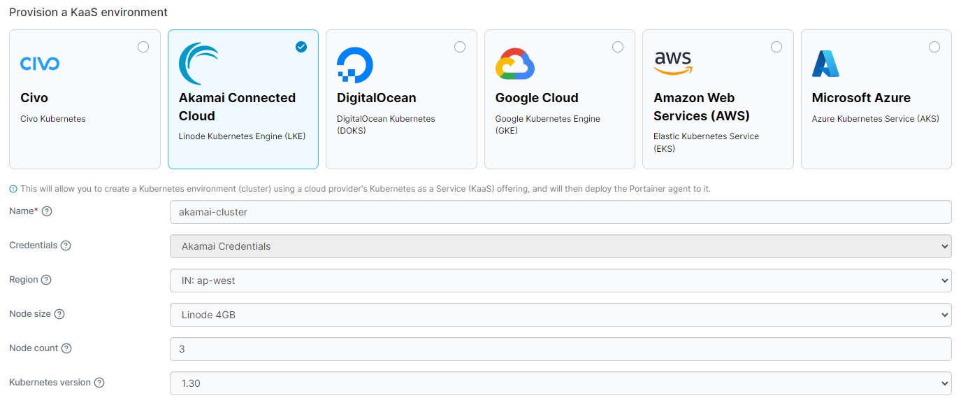 Select the Akamai Connected Cloud option from the list of providers. If you haven't already provided your API token you'll be asked to provide credentials. Provide a name for your credentials and paste your API token into the API key field and click Add credentials.