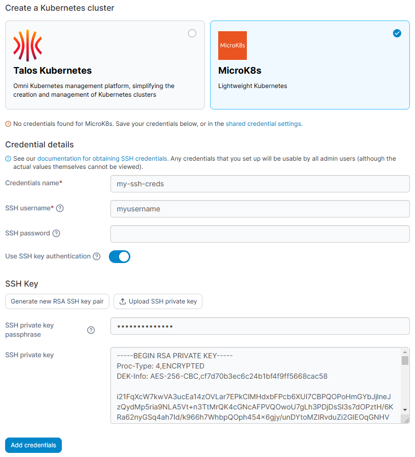 If you have not yet configured a set of SSH credentials, you will be asked to provide them now. If you already have a credential set configured, you can skip to cluster configuration.
