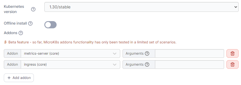 Optionally click the Add addon button to select one or more addons to deploy alongside the MicroK8s installation. You can also specify any arguments needed for each addon. This is disabled if Offline install is enabled.