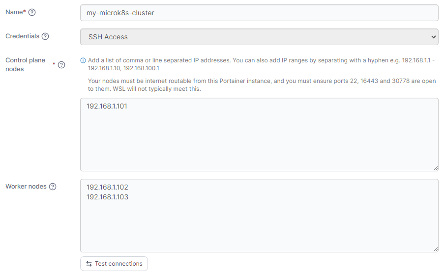 Once you have selected a credential set and entered the node IPs, you can click Test connections to ensure the credentials work for all the IP addresses and that they are reachable from the Portainer Server instance. If there are any issues connecting to the nodes they will be displayed.
