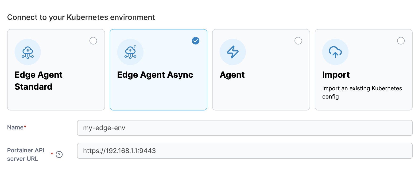 Select Kubernetes then click Start Wizard. Then select the Edge Agent Async option. Enter the environment details using the table below as a guide.