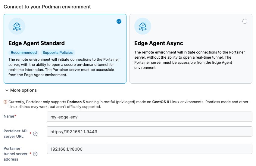 Select **Podman** then click **Start Wizard**. Then select the **Edge Agent Standard** option. Enter the environment details using the table below as a guide.