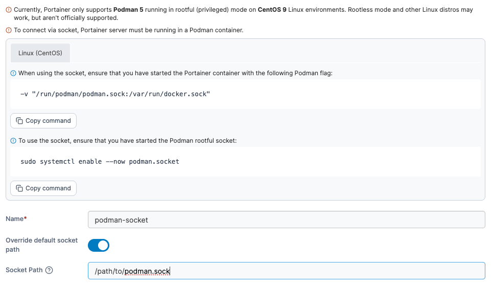 <figure><img src="https://content.gitbook.com/content/MdgxA76kWxcRmwybM8Ft/blobs/sxbELY6GV5iQvU2TAqBm/2.22.0-environments-add-podman-socket-2.png" alt=""><figcaption></figcaption></figure>