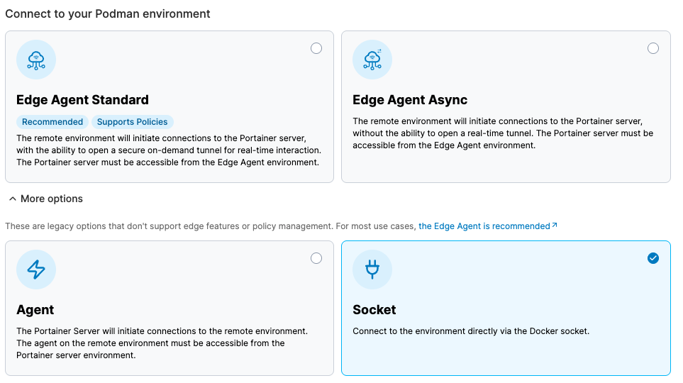 Connecting to the Podman Socket is a legacy option that does not support edge features or policy management. For most use cases, [the Edge Agent is recommended](https://docs.portainer.io/sts/faqs/getting-started/why-do-we-recommend-using-the-edge-agent-instead-of-the-traditional-agent).