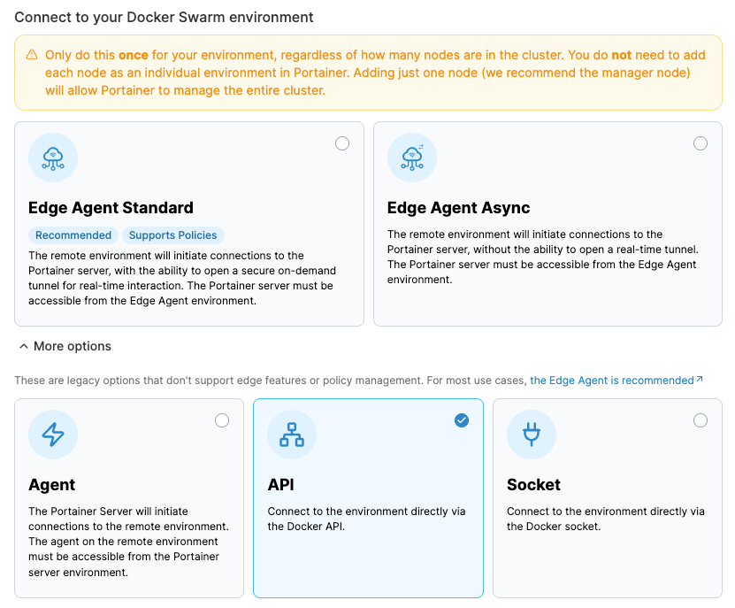 Connecting to the Docker API is a legacy option that does not support edge features or policy management. For most use cases, the Edge Agent is recommended.