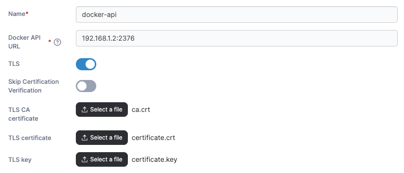 Toggle this option on to skip the verification of the TLS certificate used by the Docker API. If this option is off, the below fields will not appear.