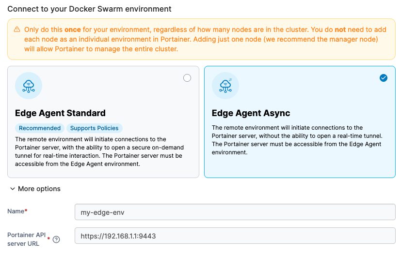 As an optional step you can expand the **More settings** section and adjust the **Ping**, **Snapshot** and **Command** intervals for the environment - this defines how often this Edge Agent will check in with the Portainer Server for status updates, snapshot updates and to see if there are new pending commands to run, respectively. The default for each is once a minute, but the defaults can be adjusted in the [Edge Compute settings](https://docs.portainer.io/sts/settings/edge#async-check-in-intervals).&#x20;