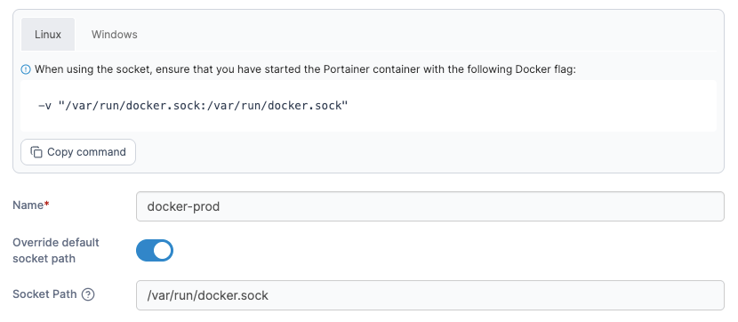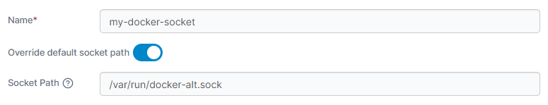 Toggle this option on to override the default /var/run/docker.sock socket path.