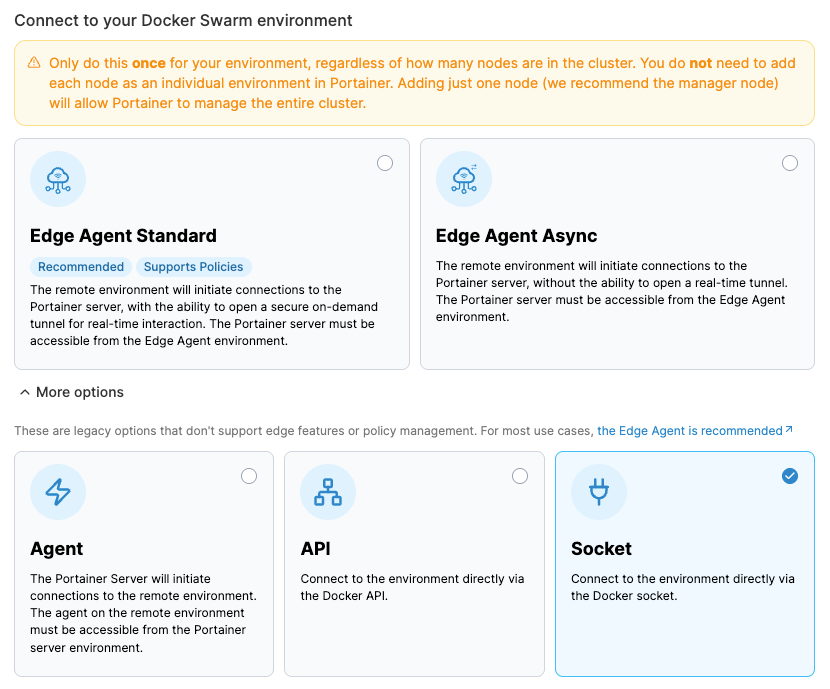 Connecting to the Docker socket is a legacy option that does not support edge features or policy management. For most use cases, the Edge Agent is recommended.