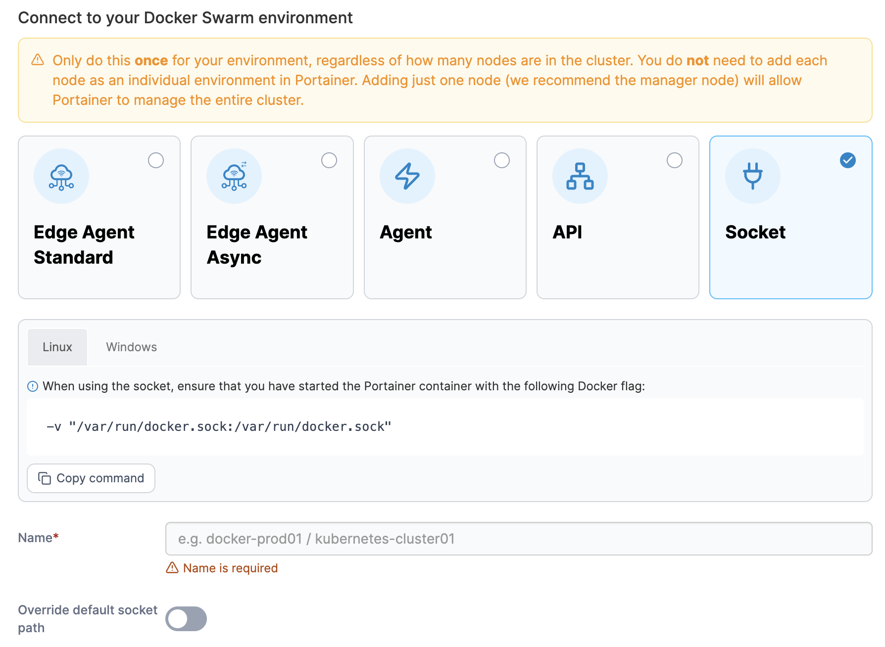 Next, select Docker Swarm as the environment type then click Start Wizard. Select the Socket option and your platform. You will be shown the required parameter to pass to the Portainer container as part of your Portainer Server deployment.