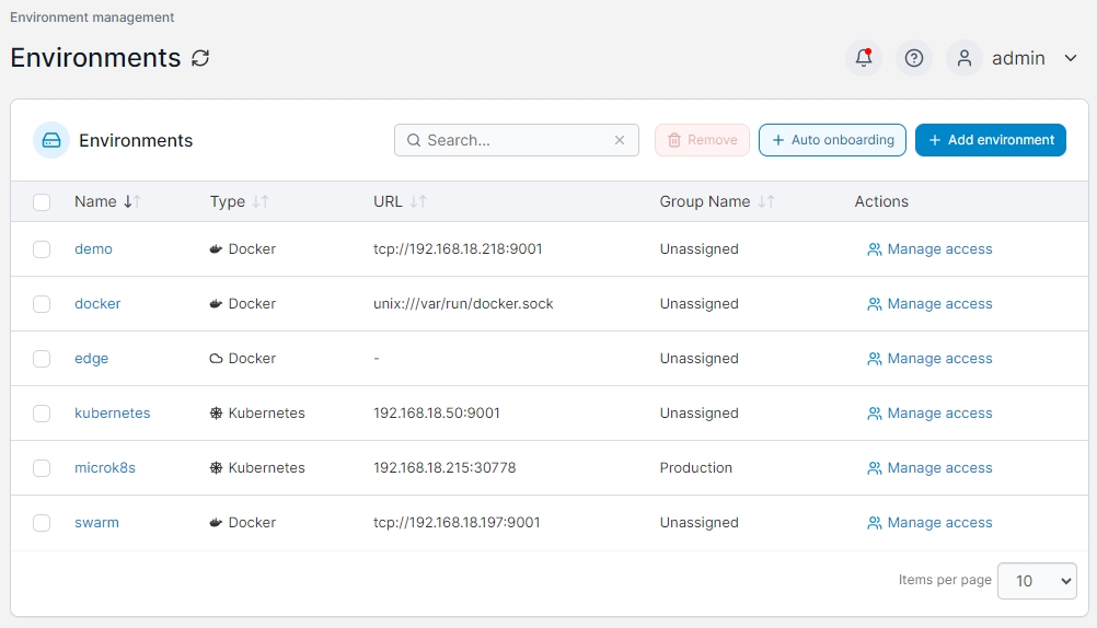 The Environments page lists the environments that can be managed with your Portainer installation. Here you can add new environments either manually or through auto onboarding, as well as manage which users and groups have access to individual environments.