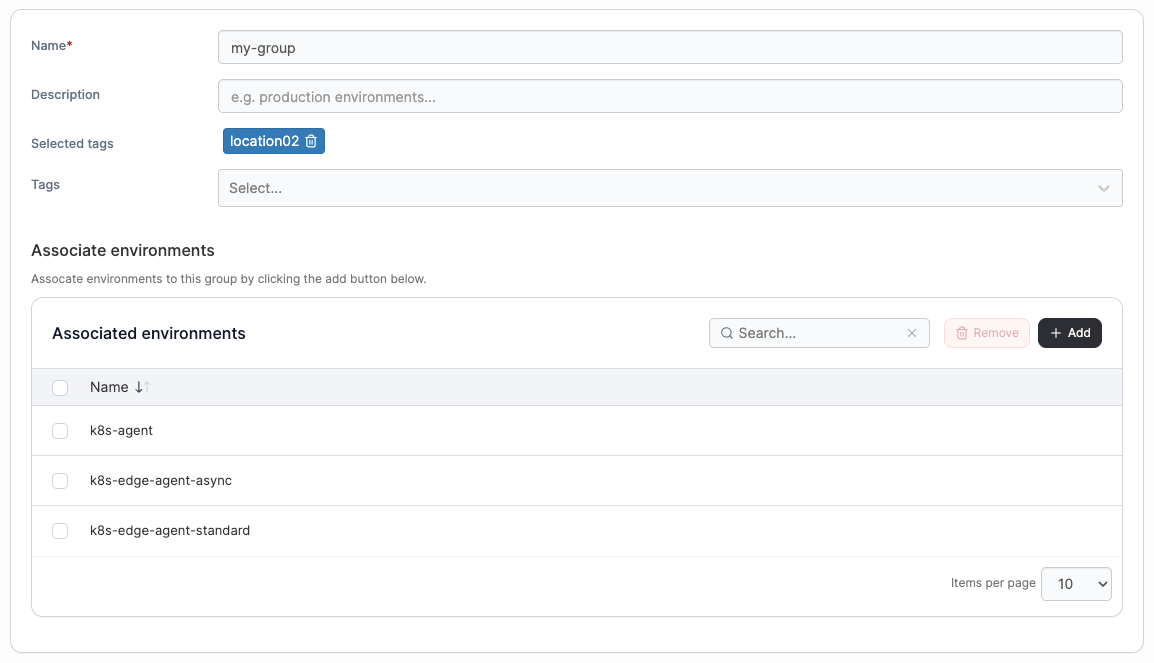 A table showing the environments to be added to the group. Use the Add button in the top right corner of the table to select your environments. To remove an environment from the list, select the checkbox next to the entry and click Remove in the top right corner of the table.