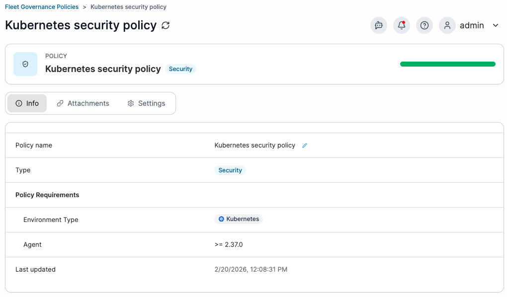 | Policy Requirements | The policy requirements define the conditions an environment must meet to be added to this policy, such as the environment type and agent version. Currently, policies can only be applied to Edge (Standard) Agent environments running version 2.37.0 or later. |