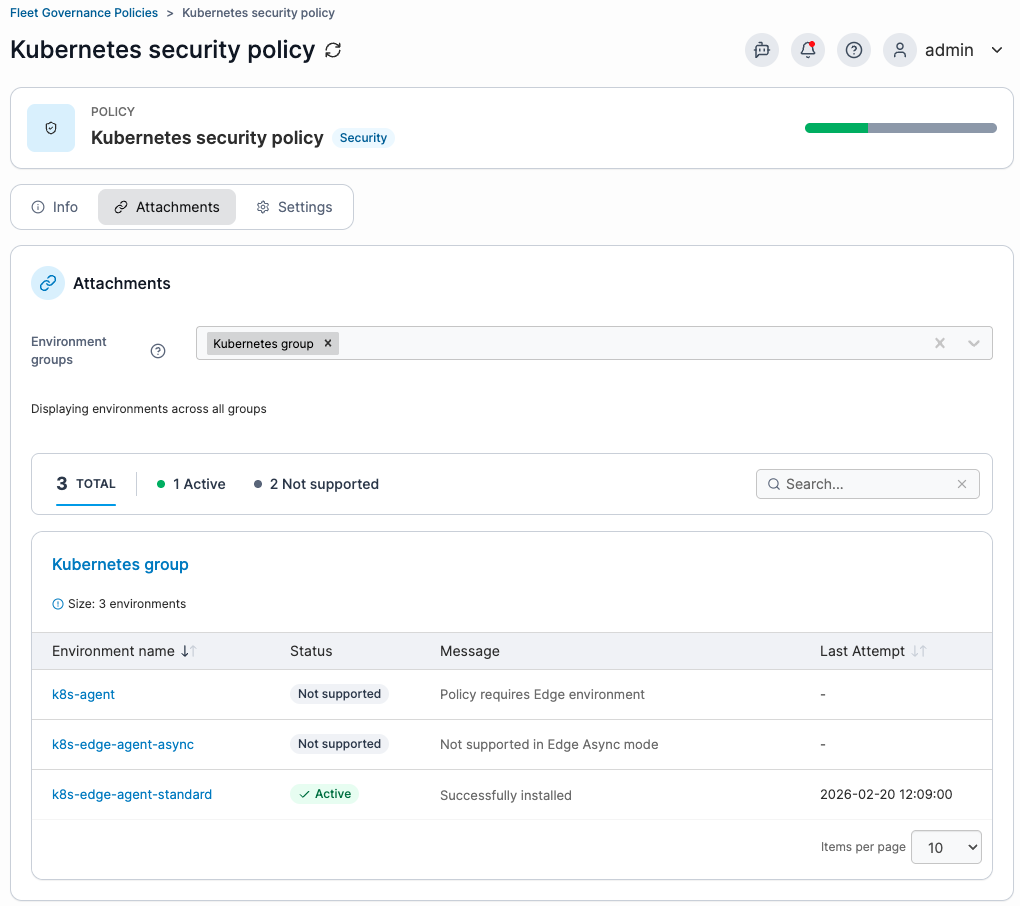 If a policy attachment fails, it is automatically retried every 15 minutes. If the **Message** field shows “Failed to install/upgrade Helm chart”, the issue is at the environment level and must be resolved before the policy can be applied.