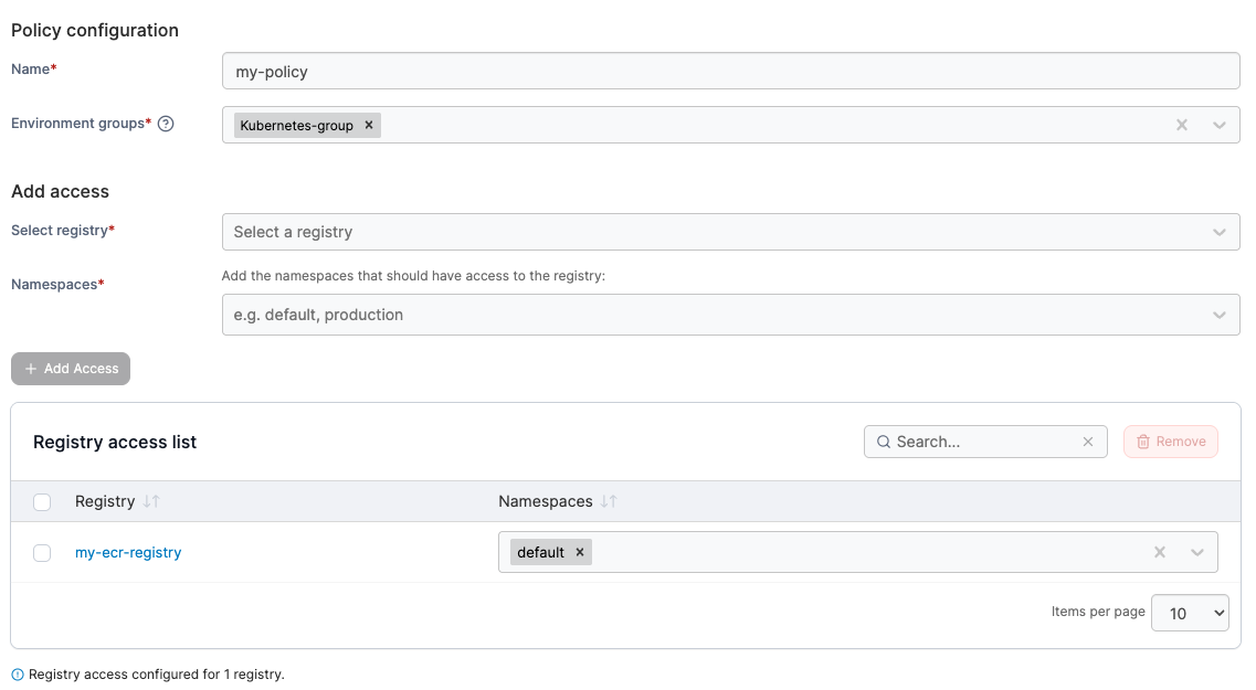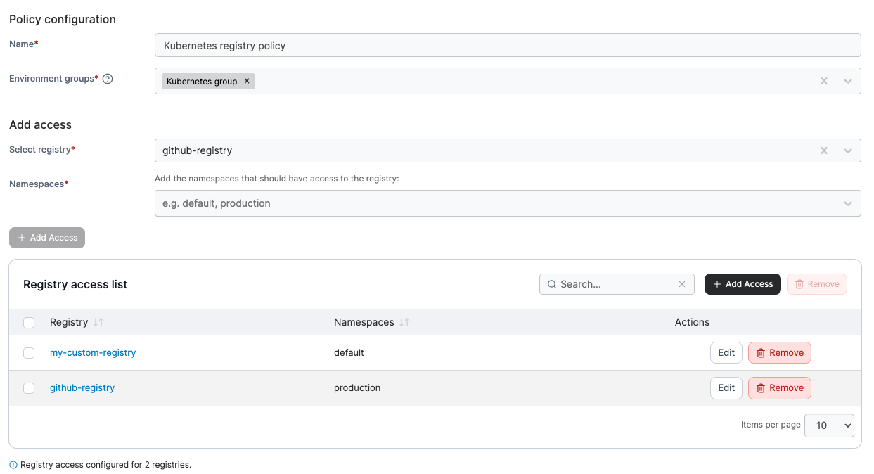 Define a policy by managing registry access and configuration for Kubernetes clusters.