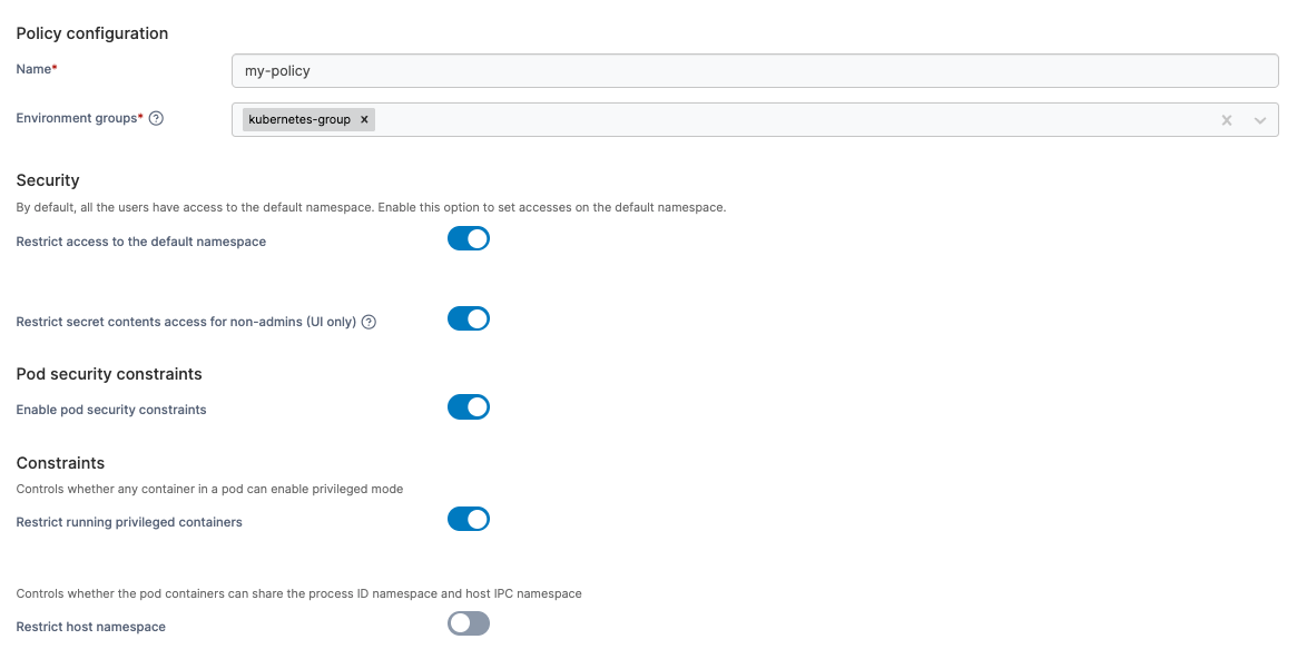 | Enable pod security constraints                          | <p>Pod security constraints can be used to define under what conditions workloads can run. To set these constraints, toggle this option on, then toggle and configure the features you require. <br>More information on each pod security constraint option can be found in the Kubernetes <a href="../../../../user/kubernetes/cluster/security">security constraints</a> documentation.</p> |