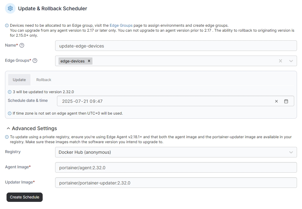 When you're ready, click Create Schedule to schedule the update. You will be returned to the Update & Rollback page where you can check the status of your scheduled update.
