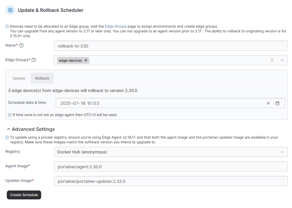 To schedule the rollback of an update, click the Schedule update or rollback button, then fill out the form.