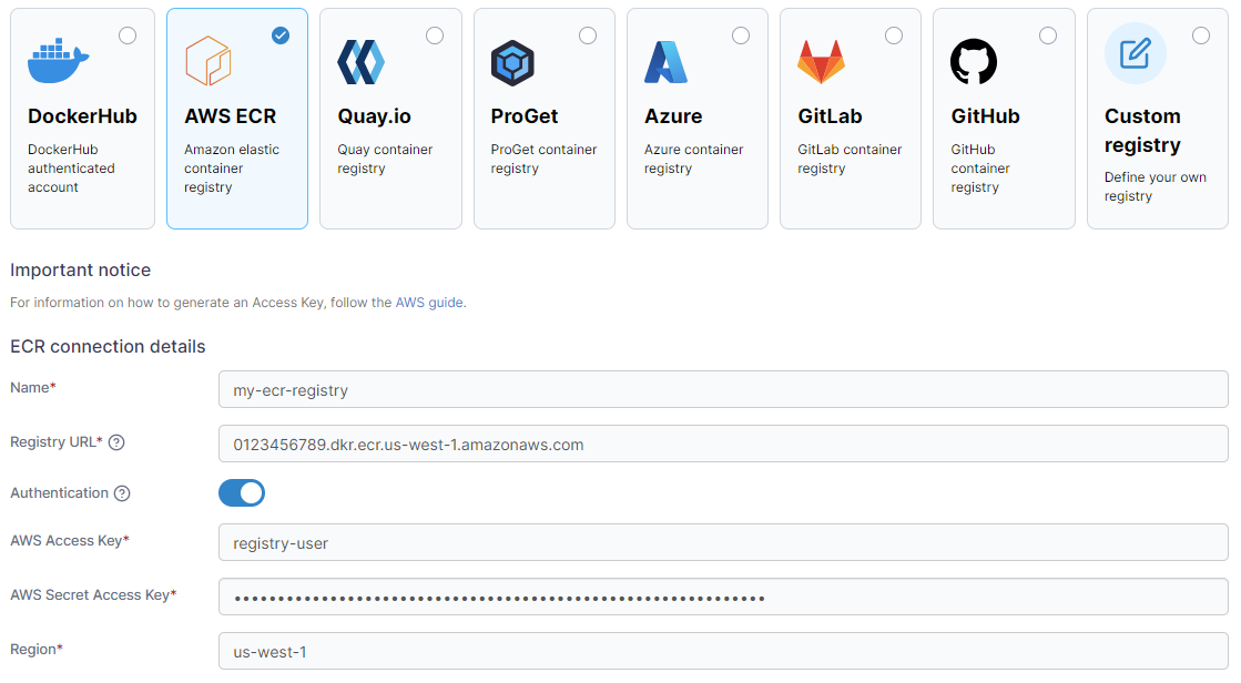 Enter the URL of your AWS ECR registry, including the account ID and region. You can find this in the AWS console under Amazon Container Services, ECR, Registries.
