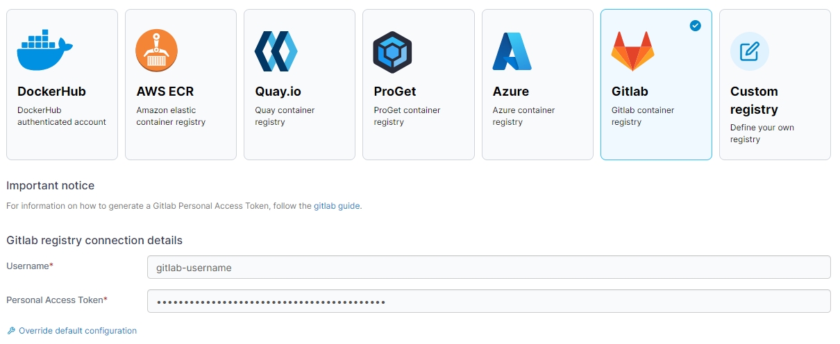 Enter the personal access token that corresponds to the username above. Your personal access token will need the read_api and read_registry scopes assigned.